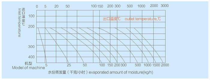 水份蒸发量与物料的特性及热进风、出口温度相关。当出口温度为90oC,其水份蒸发曲线见上图(供选型参考),随着产品不断更新,有关参数变更,恕不预先通知。