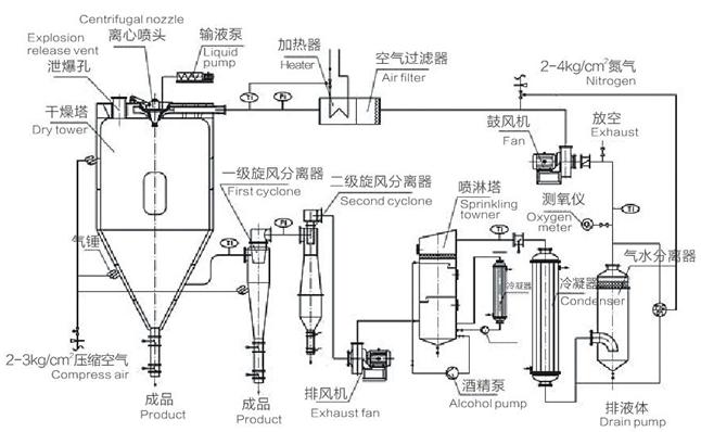 GXP系列闭式循环喷雾干燥机是在密闭的环境下工作,干燥介质为惰性气体(一般为N2),适用于有机溶剂的物料干燥有毒气的物料或干燥过程中易发生氧化的物料的干燥。该系统采用惰性气体作为循环气体,对干燥的物料具有保护作用,循环气体经历载湿、去湿的过程,介质可重复使用。氮气经加热器加热后进入干燥塔,液体物料经螺杆泵输送至离心喷头处,液体被高速循环的雾化器雾化成液滴,在干燥塔内完成热质交换过程,被干燥后的粉状物料从塔底排出,被蒸发的有机溶剂气体在风机负压的压力下,把夹在气体中的粉尘经旋风分离器、喷淋塔除尘后饱和的有机溶剂气体经冷凝器冷凝成液体排出冷凝器,不凝性气体介质连续加热后作为干燥载体在系统内重新循环使用。而常规的普通的离心喷雾干燥是通过不断的送、排风达到排湿的目的,这也是防爆型闭式离心喷雾干燥设备与普通离心喷雾干燥设备的一个明显区别;干燥系统内干燥介质为N2,内部为正压操作,保持一定的正压值,如果内部压力下降,由压力变送器来自动控制N2进量,保证系统压力平衡。